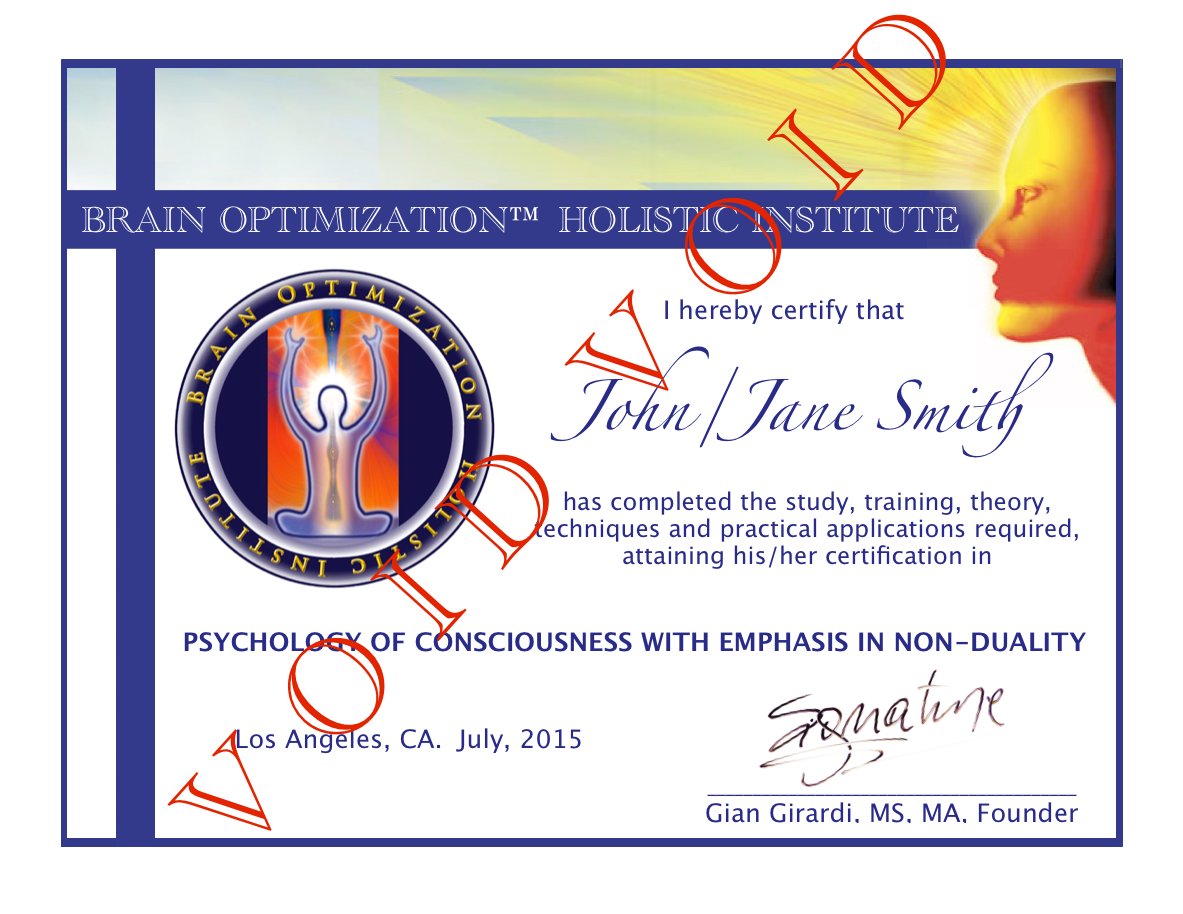 The Brain Optimization™ Holistic Institute offers classes, information and courses with certifications on drug free solutions to ADD, ADHD, depression, anxiety, chronic pain, substance abuse and other forms of brain / mental suffering and disorders. Certifications include Brain Optimization™ with Emphasis in Nutrition, Life/Wellness Coaching with Emphasis in Cognitive Psychology and Psychology of Consciousness with Emphasis in Non-Duality. The Brain Optimization™ Holistic Institute also offers a Certification in Holistic Life Coaching for those who complete